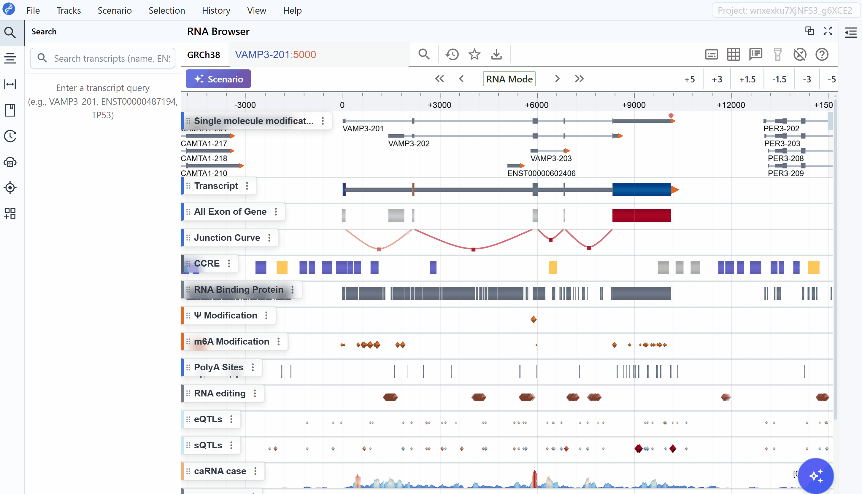 - Displays the name of each track (e.g. “M6A-Modifications”, “Junction”, “RNA”).
