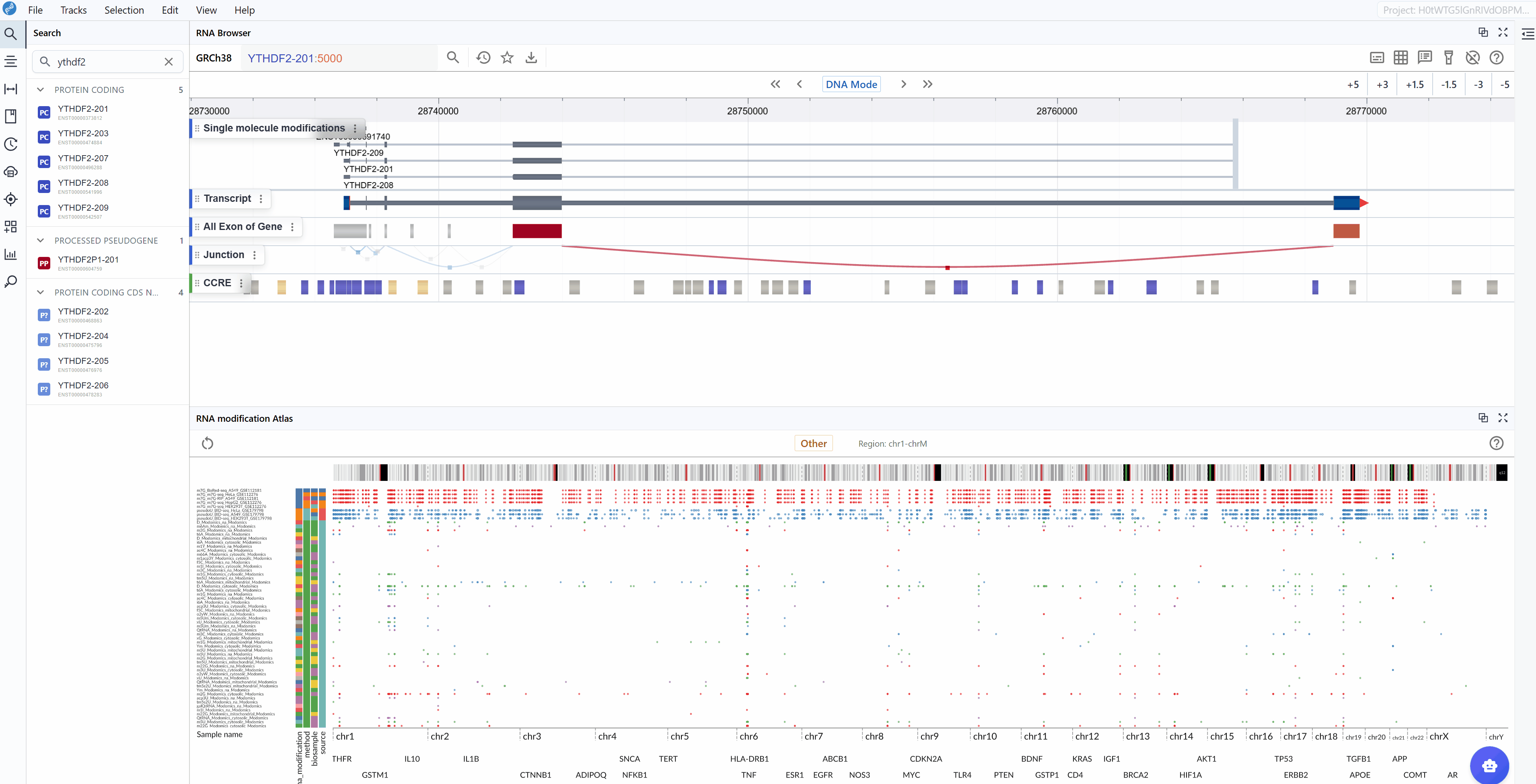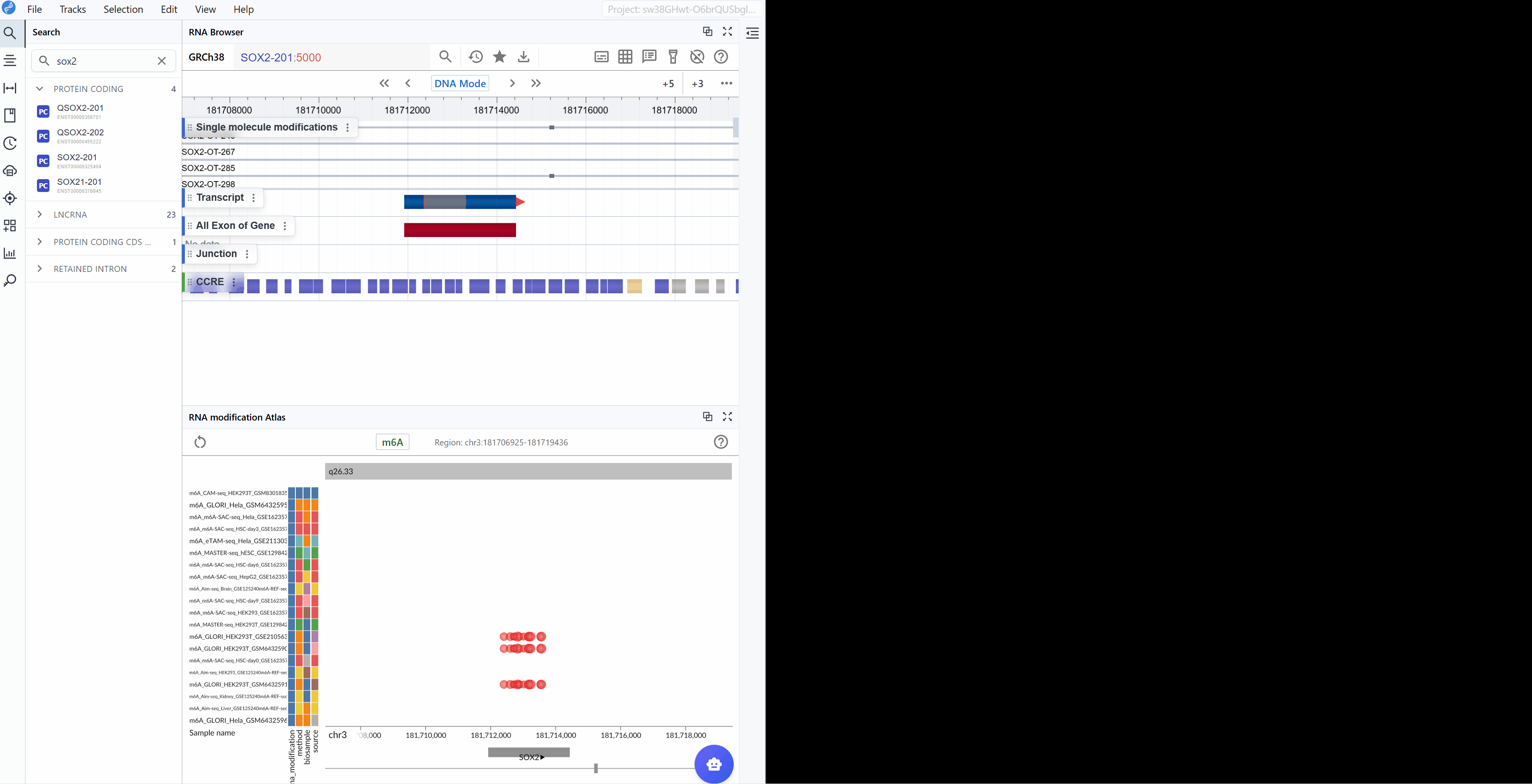 Automatic focusing: Once selected, the viewer will automatically zoom to and center on the chosen transcript, displaying all available modification data within and around the transcript region. This allows you to immediately assess the modification profile of your gene of interest.