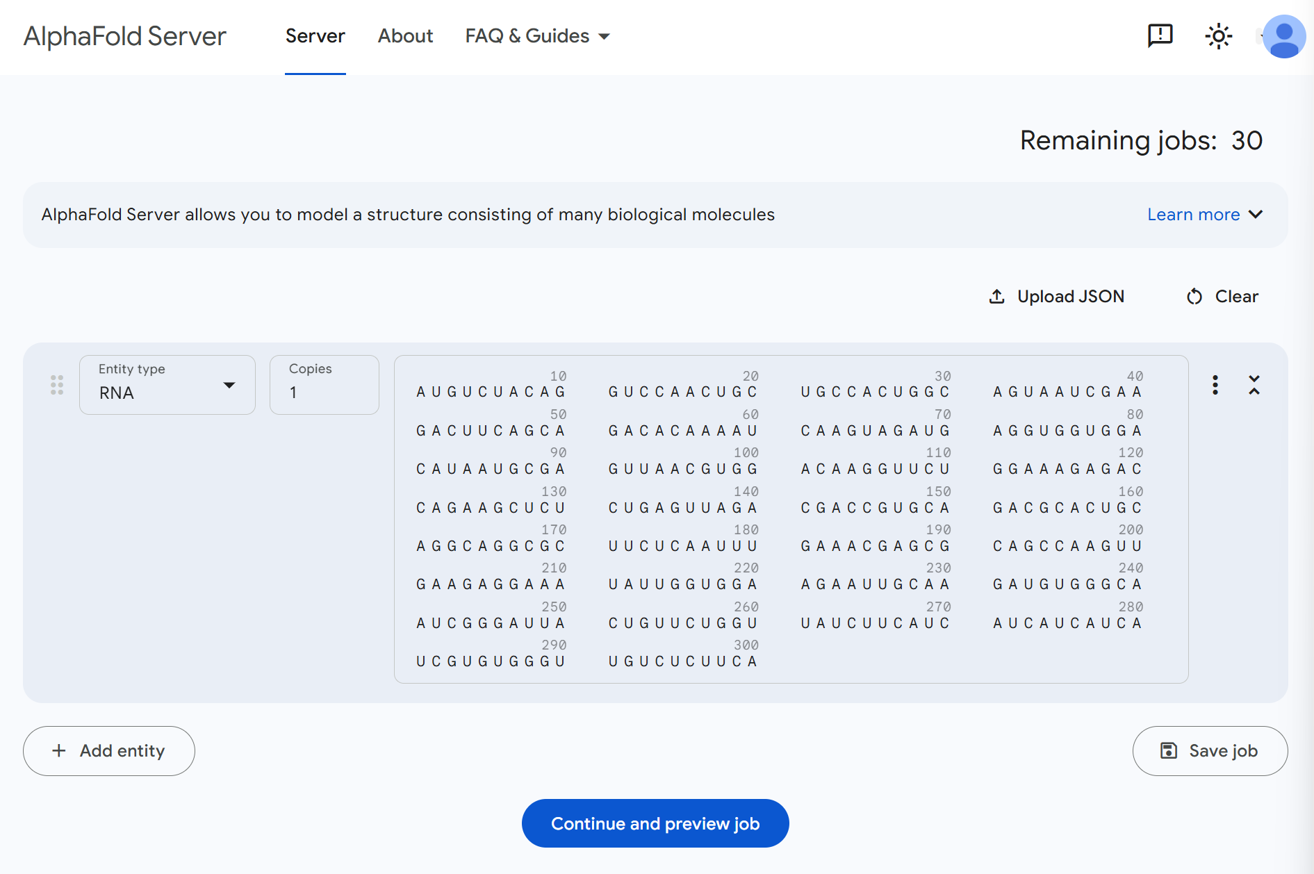 Account required: You may need to create a free AlphaFold Server account Sequence length: AlphaFold performs best on sequences up to ~2000 nucleotides Check sequence format: Ensure the sequence contains only valid RNA nucleotides (A, U, G, C)