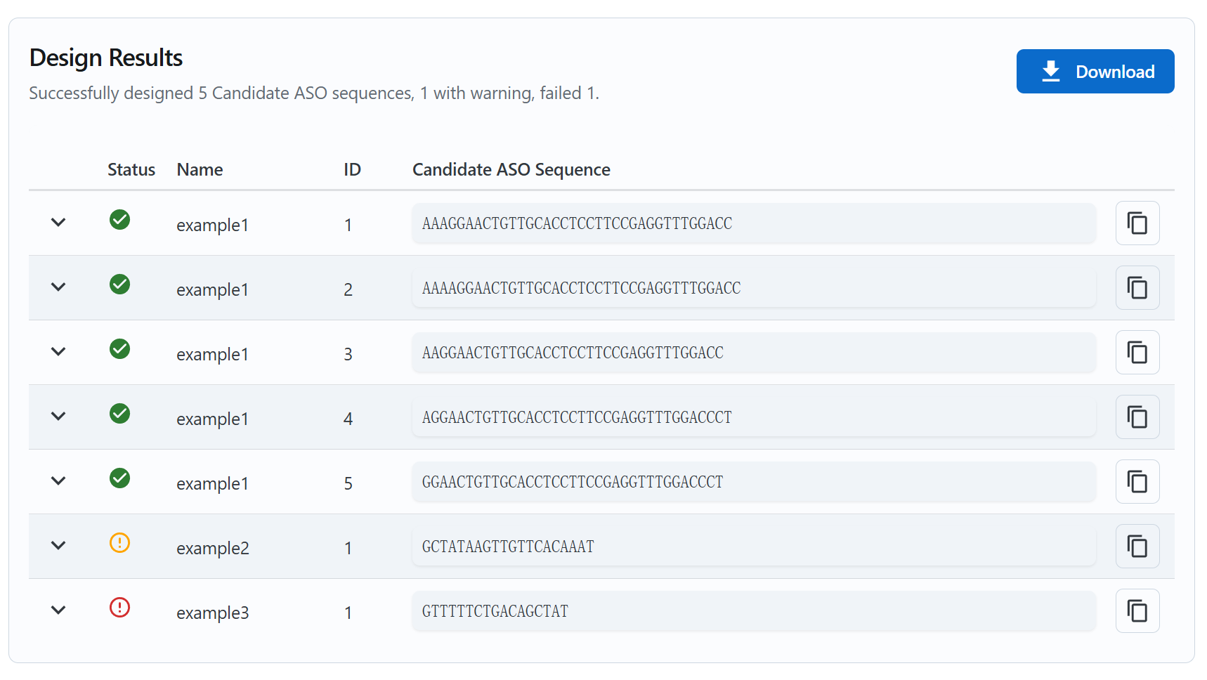 Copy sequences: Click the button next to each candidate to copy the sequence to your clipboard for ordering or further analysis