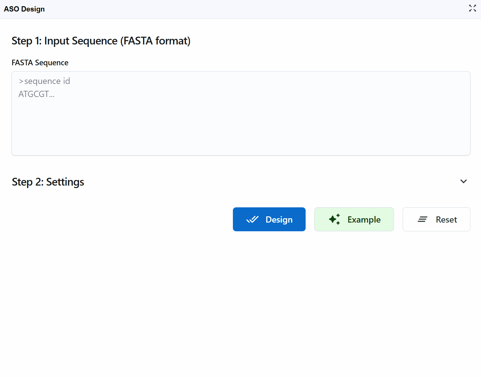When you click the ASO Design plugin button, a new window opens providing a comprehensive interface for sequence input and parameter configuration.